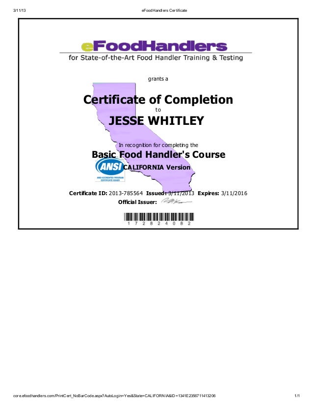 Also, you'll need to take a copy of your certificate of completion to your employer because california law requires them to maintain records of food handler training for all employees. The california food handlers card law (based on sb303) requires all food handlers, unless exempt, to get a food handlers card within 30 days of date of our ca food handlers certificate training and test are 100% online, state approved & ansi accredited. Just 3 easy steps to earn a certificate of course completion and official california food handlers card! California requires food handlers to earn a ca food handlers card within 30 days from the date of hire (also referred to as a food handlers certificate or food handlers permit or license). Food handlers card, california approved, ansi accredited food safety training certification. Successful completion of the program assures food managers, regulators and trainers that the certificate holder has completed a. The servsafe food handler online course and assessment is a comprehensive solution that delivers consistent food safety training to employees. Ansi accredited and california approved food handler training provided by the institute of food safety, health, & hygiene, inc. All instructional materials and exams are. We invite you to take our test that allows you to obtain your food hygiene certificate. National registry of food safety professionals. Food safety first principles for food handlers certificate program provides food handlers with the basic knowledge they need to safely handle food for human consumption. It may be completed by any individual seeking knowledge of basic.